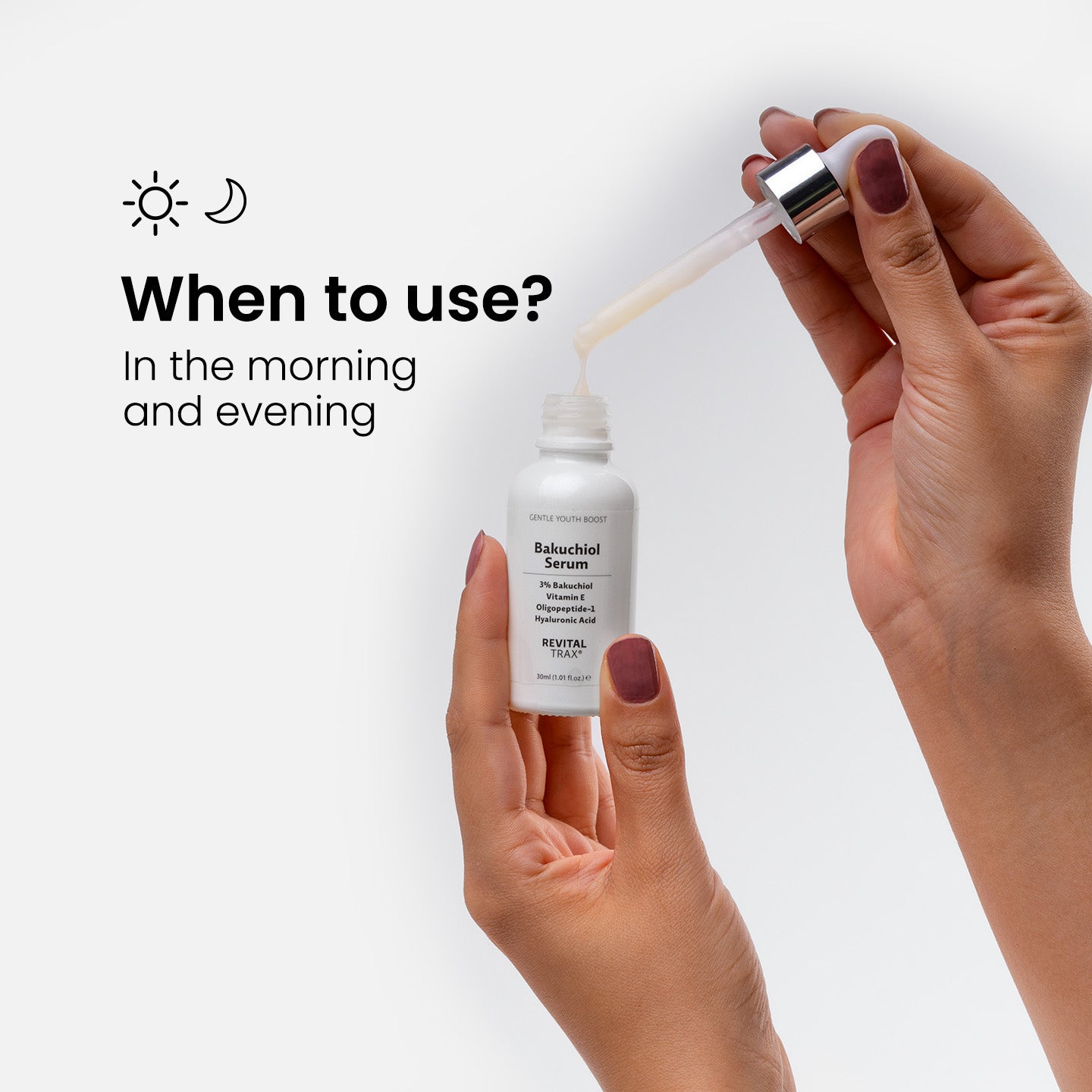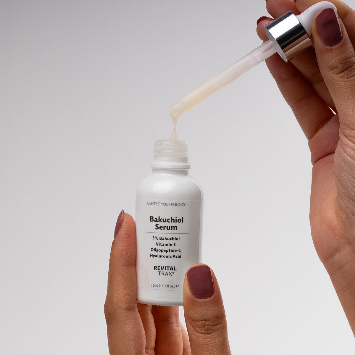 The 3% Bakuchiol Serum by RevitalTrax contains a potent concentration of bakuchiol that helps renew, firm and visibly even out the skin for a smooth and radiant complexion.