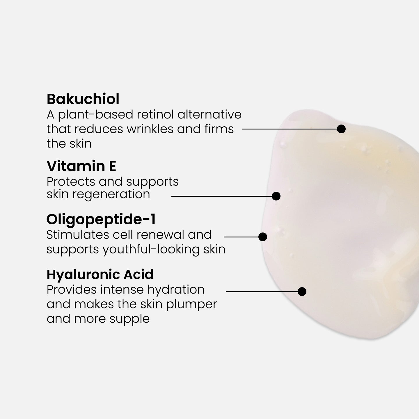 Bakuchiol is a plant-based ingredient derived from the babchi plant (Psoralea corylifolia) and is praised as a natural alternative to retinol. It helps renew the skin, smooth the complexion and reduce the appearance of fine lines without the potential side effects that often come with retinol. This makes bakuchiol suitable for sensitive skin and safe to use in both your morning and evening routine.