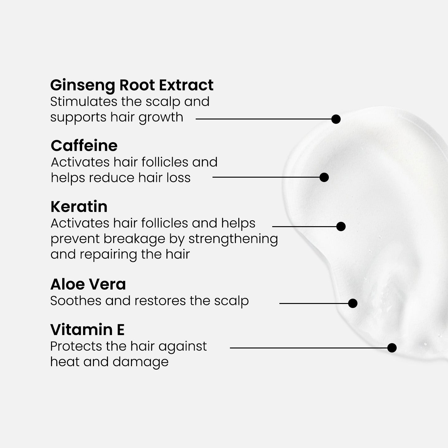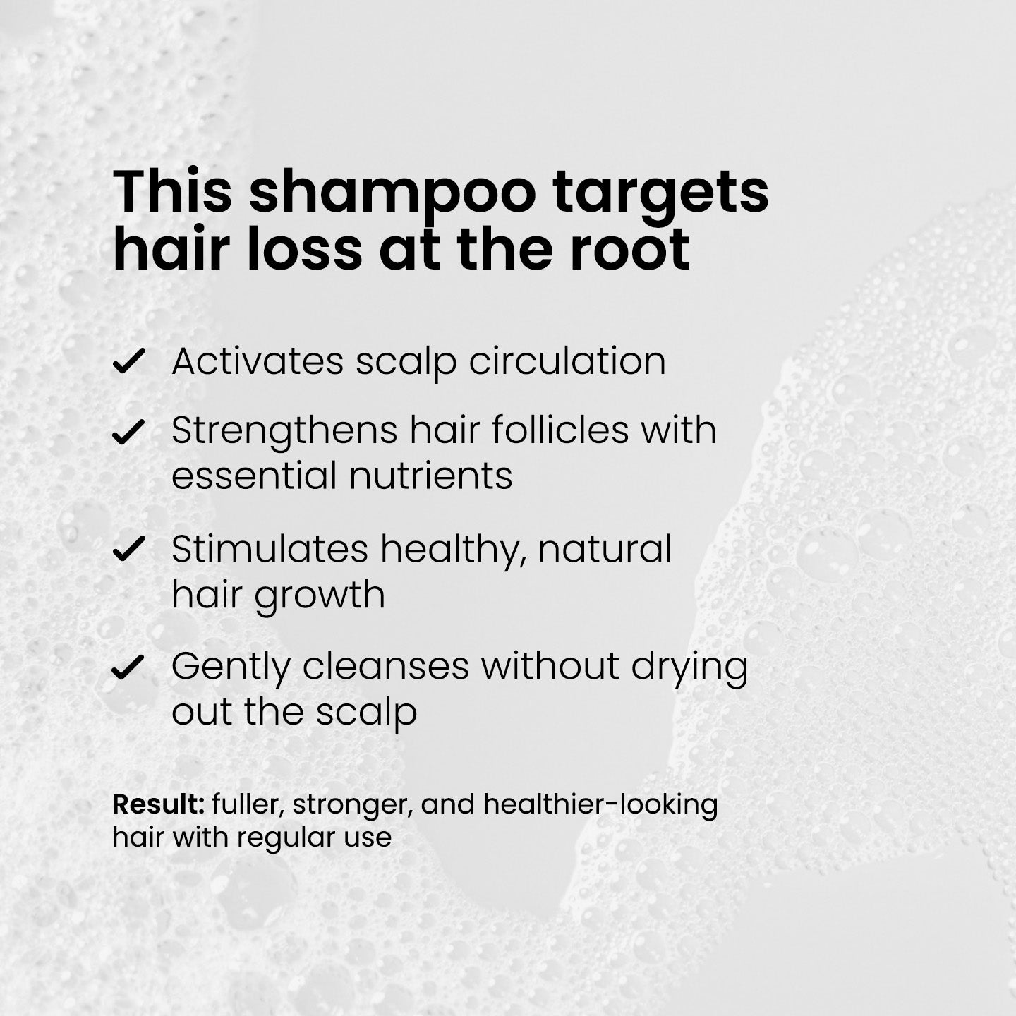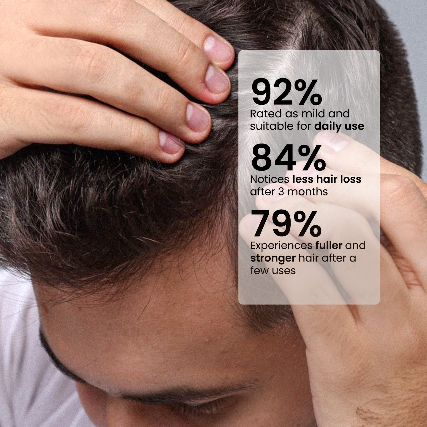 The Anti-Hair Loss Shampoo contains many active ingredients to combat hair loss and stimulate hair growth. A good example of such an ingredient is Caffeine. Studies have shown that caffeine stimulates hair follicles, slows hair loss and promotes hair growth by improving blood flow to the scalp. It also protects hair follicles from the negative influence of the hormone DHT, which is known to be a major cause of hair loss in both men and women.