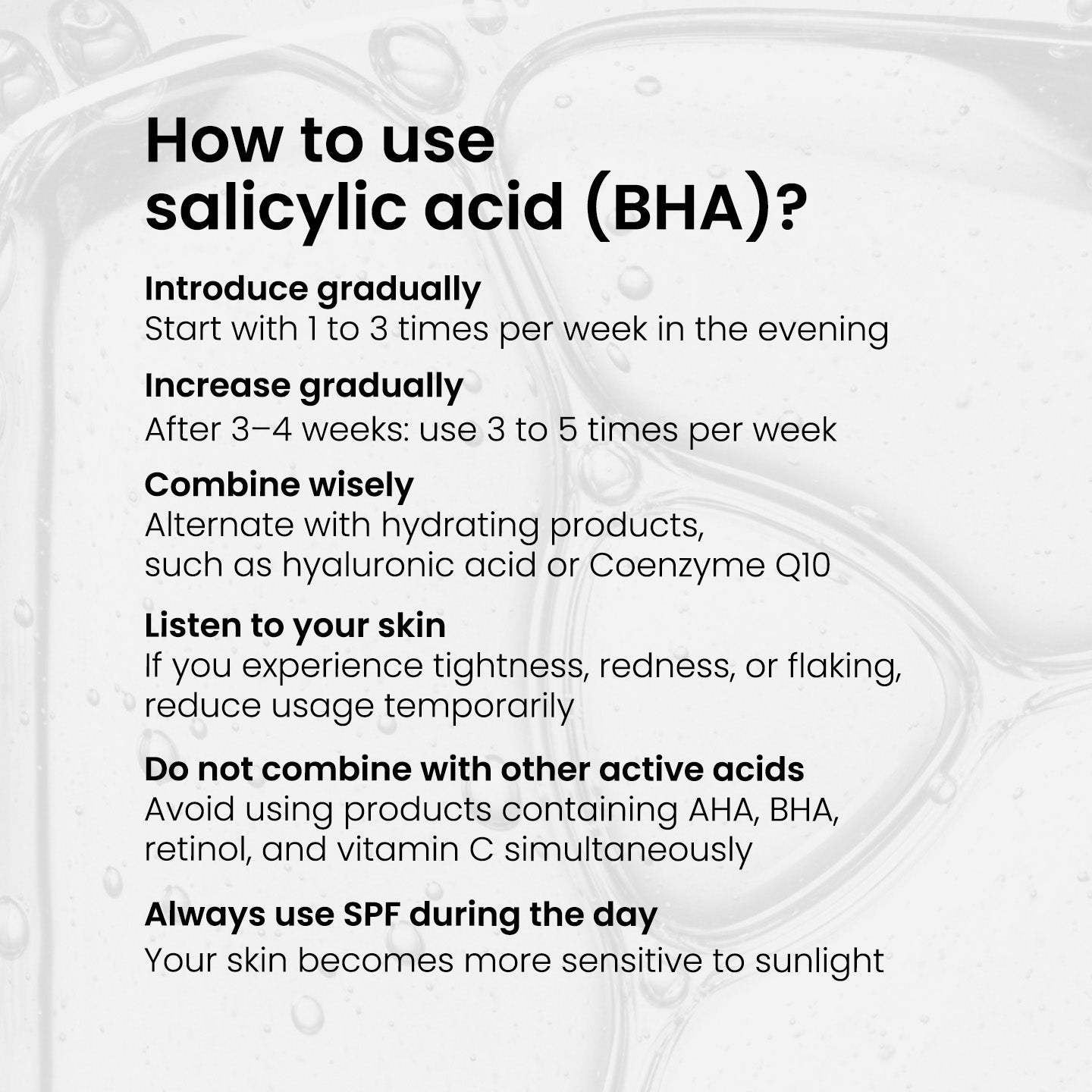 Start slowly with salicylic acid (BHA) and use it 1 to 3 times per week in the evening. This gives your skin time to adjust and helps prevent irritation or over-exfoliation.