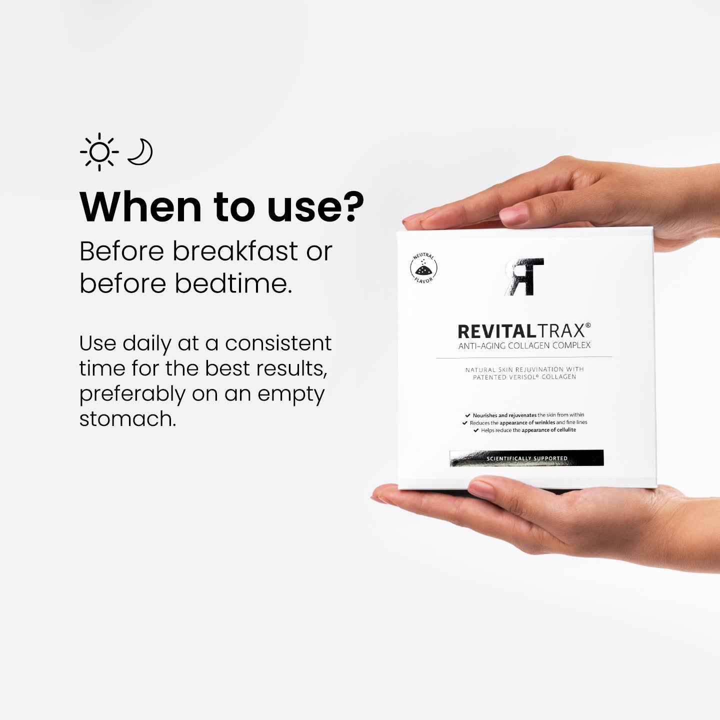 RevitalTrax Anti-Aging Beauty Collagen Complex is a unique drinkable blend of patented VERISOL® Bioactive Collagen Peptides, Biotin, Zinc, Hyaluronic Acid and Vitamin C, developed for a more beautiful skin and hair structure. It has been proven that it nourishes the skin from the inside and gives it a younger appearance.