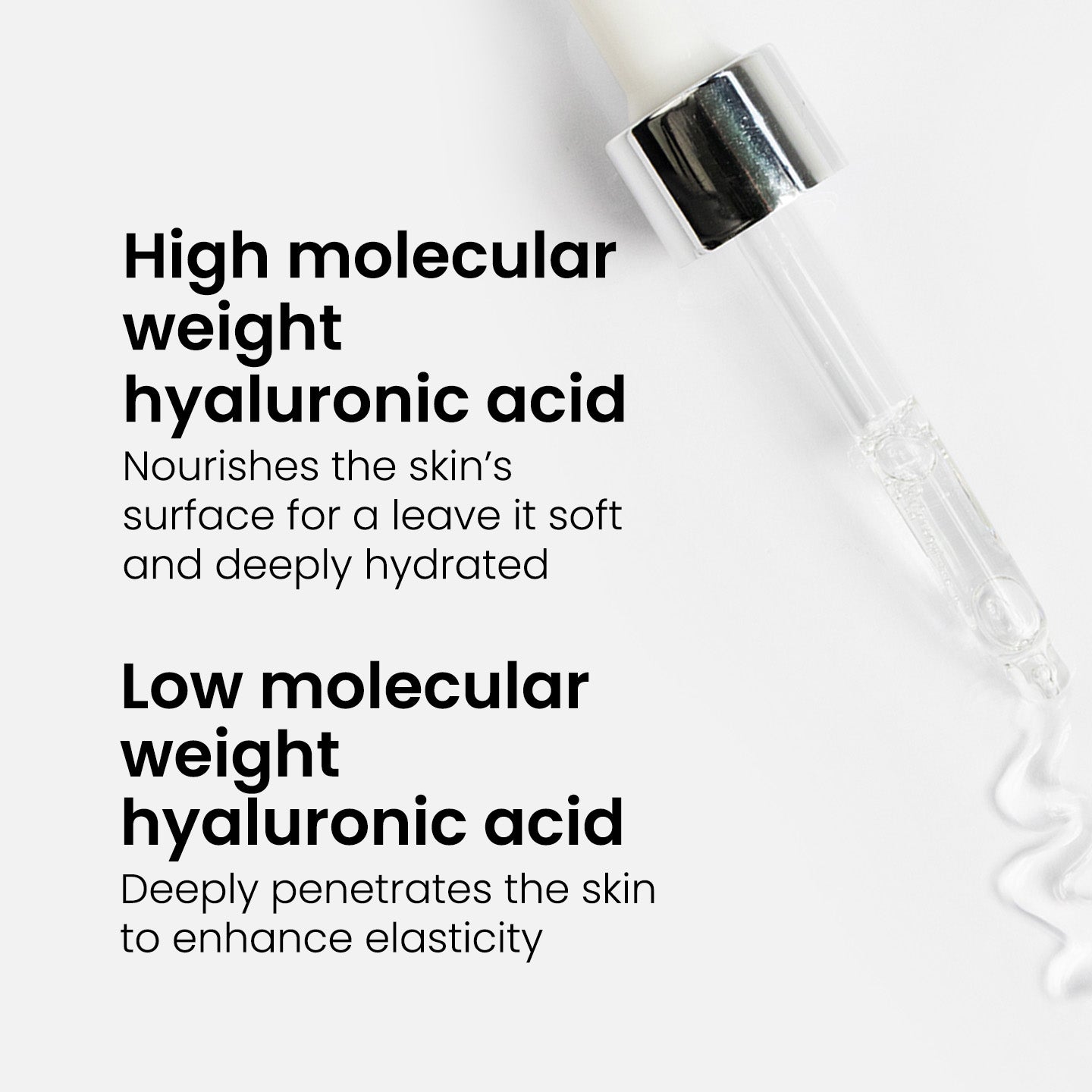 Our products with hyaluronic acid use high and low molecular hyaluronic acid. High molecular hyaluronic acid hydrates the outer layers of the skin and causes it to saturate with moisture. This is very useful and certainly necessary, but hydration of the inner layers of the skin gives even more effect. The low molecular hyaluronic acid consists of smaller molecules, which can penetrate deeper into the skin and provide the inner layers of the skin with an ultimate moisture boost.