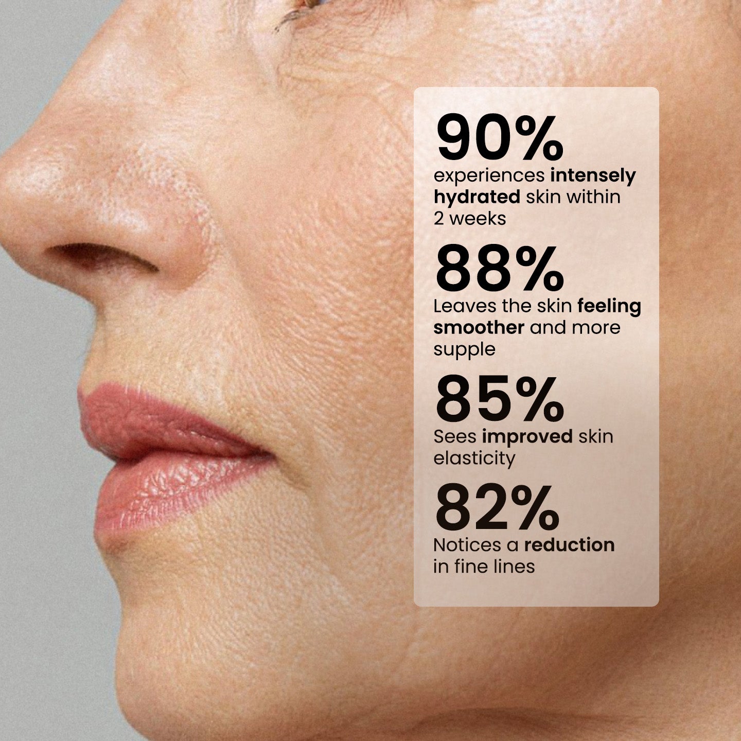 No other biologic can hold as much water as hyaluronic acid, resulting in increased smoothness, softening, reduction of wrinkles and a healthy skin barrier. Skin with a healthy skin barrier feels plumper and looks younger.