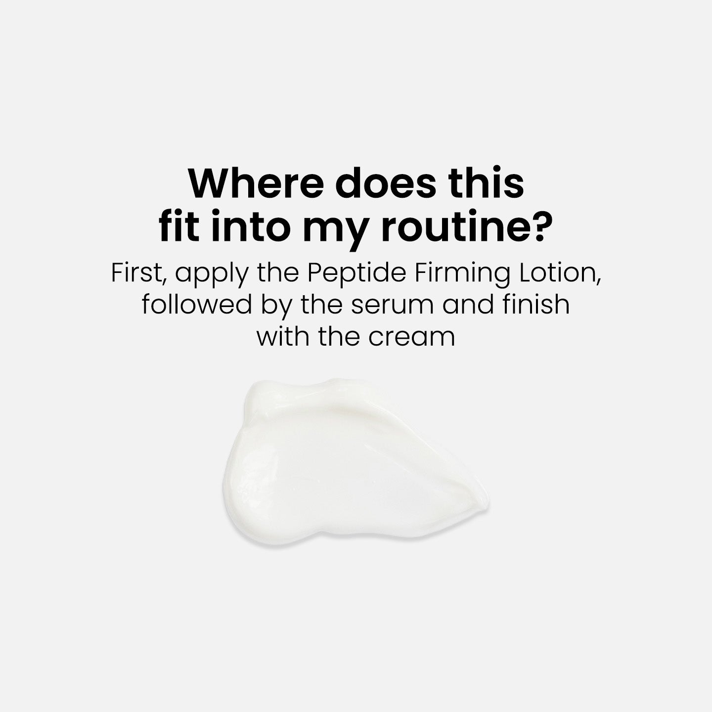 • After cleansing your skin, apply the Peptide Lotion to your neck and décolleté until absorbed. It helps restore your skin's pH level and allows for better absorption of subsequent products.