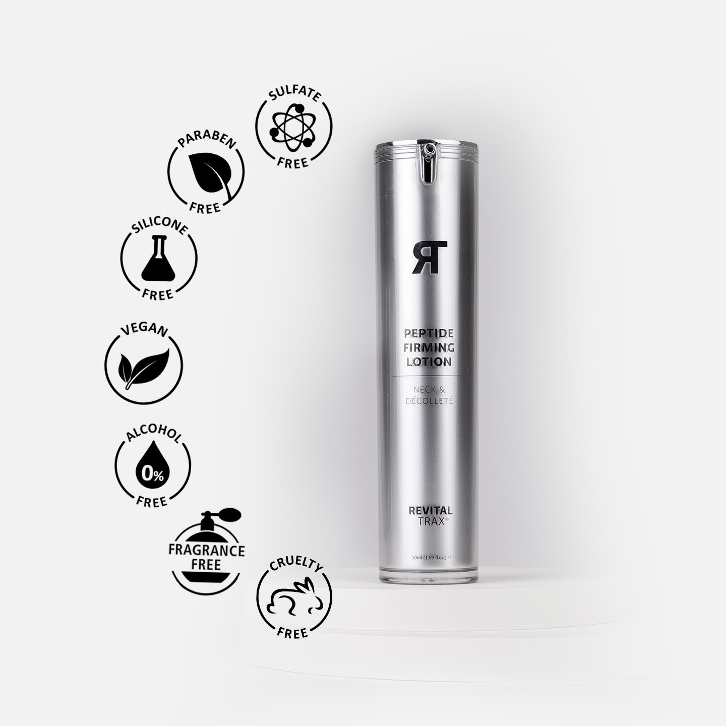 Our Peptide Firming Neck & Décolleté Lotion not only provides intense hydration and nourishment, but also restores pH levels to keep your skin healthy and balanced. In addition, this lotion prepares your skin for the rest of our Peptide line and increases the absorbency of the products for even better results.