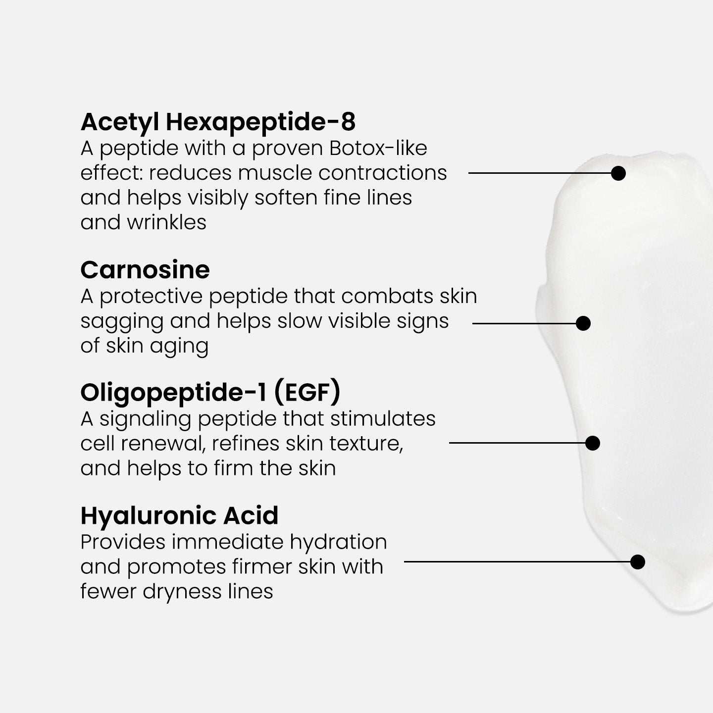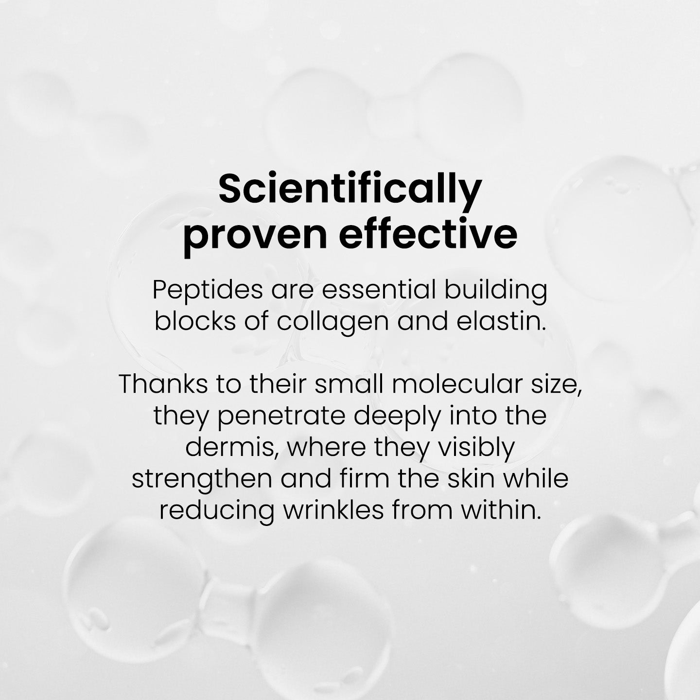 Peptides are one of the most effective active ingredients available for re-tightening the skin and reducing wrinkles. This is because they are essential building blocks of proteins in our bodies, such as collagen and elastin, which are crucial for skin firmness and elasticity.