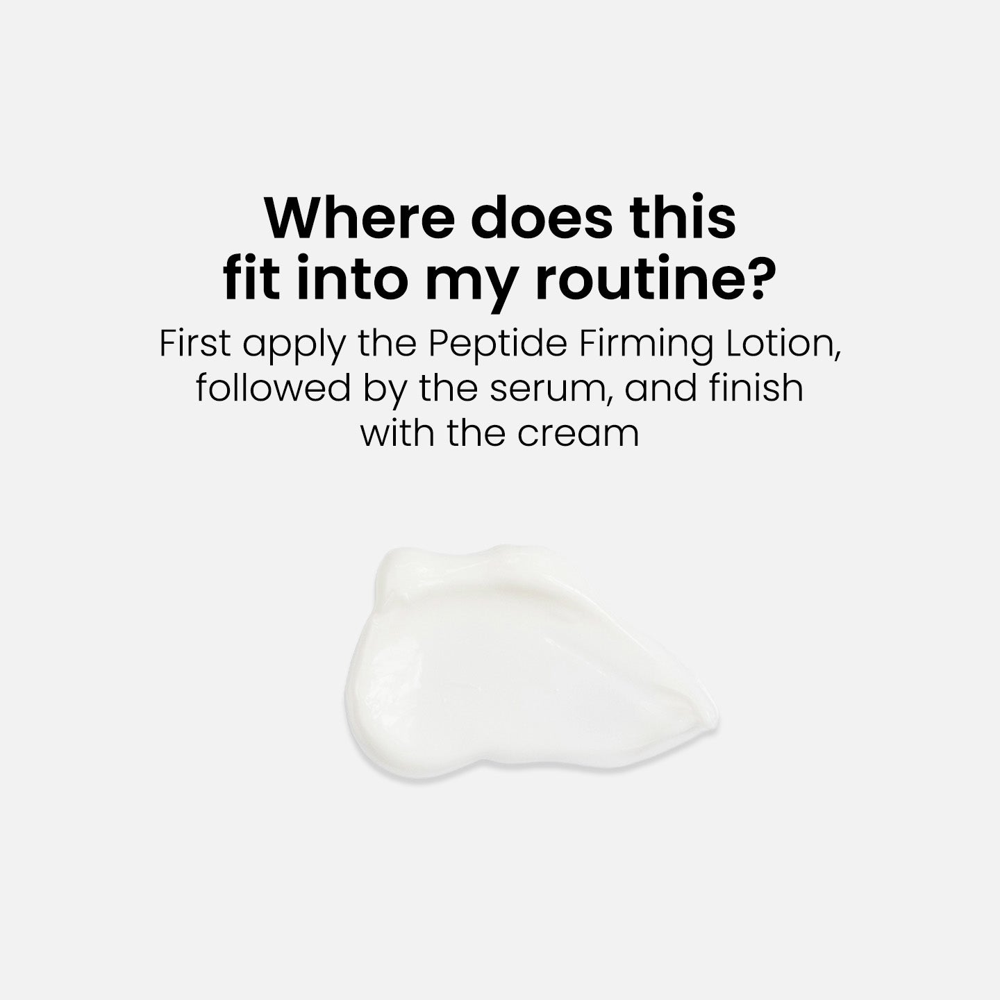 - After cleansing your skin, apply the Peptide Lotion to your neck and décolleté until absorbed. It helps restore your skin's pH level and allows for better absorption of subsequent products.