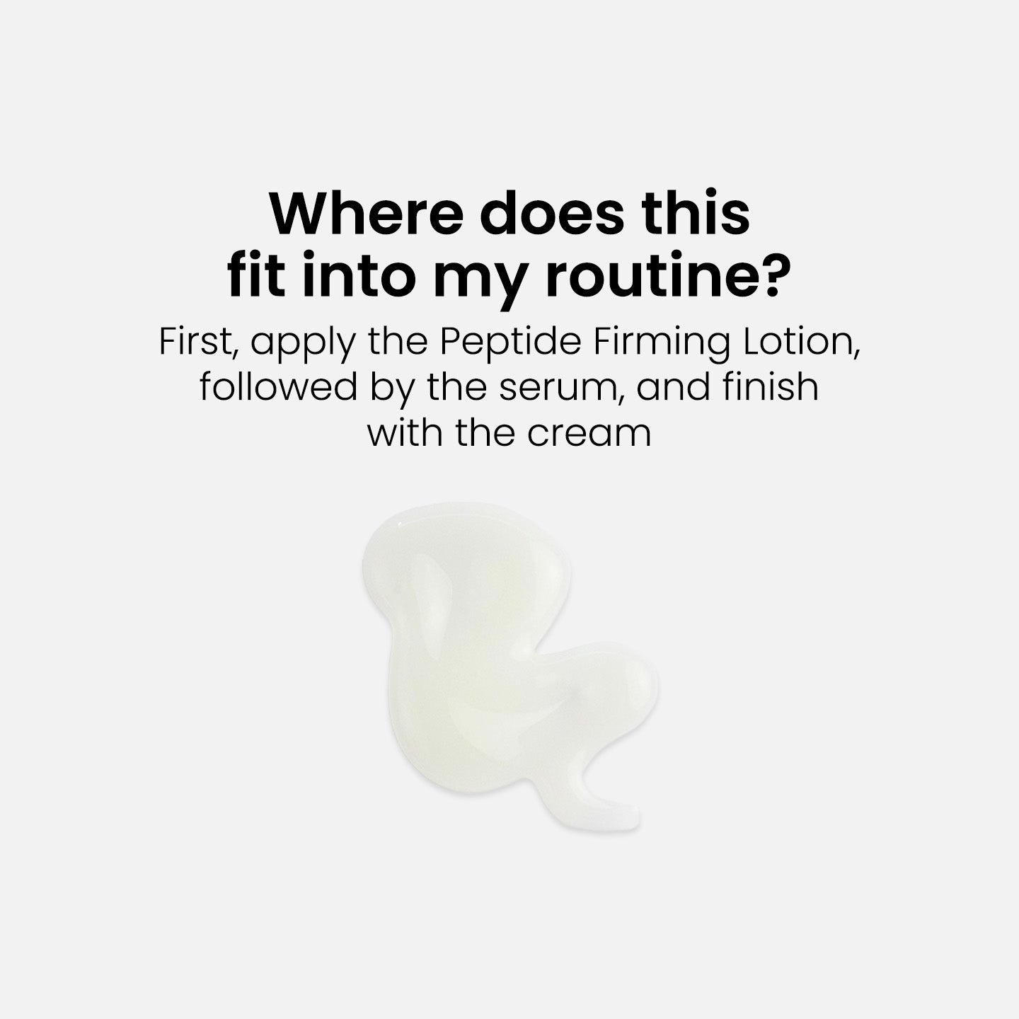 • After cleansing your skin, apply the Peptide Lotion to your neck and décolleté until absorbed. It helps restore your skin's pH level and allows for better absorption of subsequent products.
