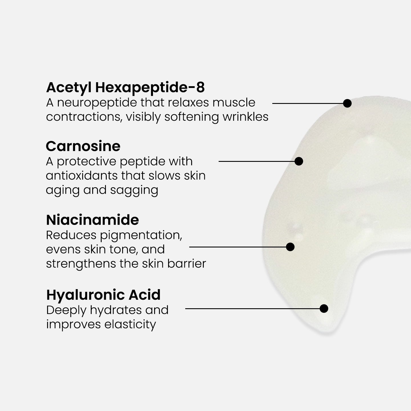 Aqua, Glycerin, Niacinamide, Ascorbic Acid, Trehalose, Myrothamnus Flabellifolia Leaf/Stem Extract, Sodium Hyaluronate, Panthenol, Tocopherol, Glycine Max (Soybean) Polypeptide, Saccharide Isomerate, Retinyl Palmitate, Oligopeptide-1, Carnosine, Selaginella Tamariscina Extract, Acetyl Hexapeptide-8, Tremella Fuciformis Polysaccharide, Tetrahydropiperine, Helichrysum Italicum Flower Oil, Phenoxyethanol, Glyceryl Stearate Citrate, Gellan Gum, Camellia Japonica Flower Extract, Adenosine, Cananga Odorata Flower Oil, Ethylhexylglycerin.