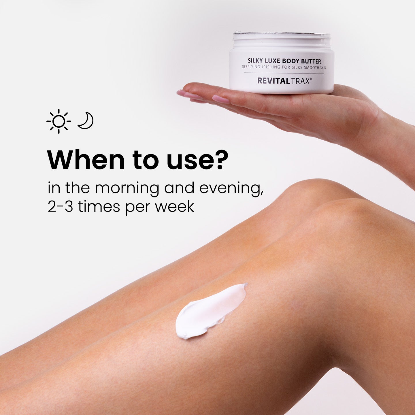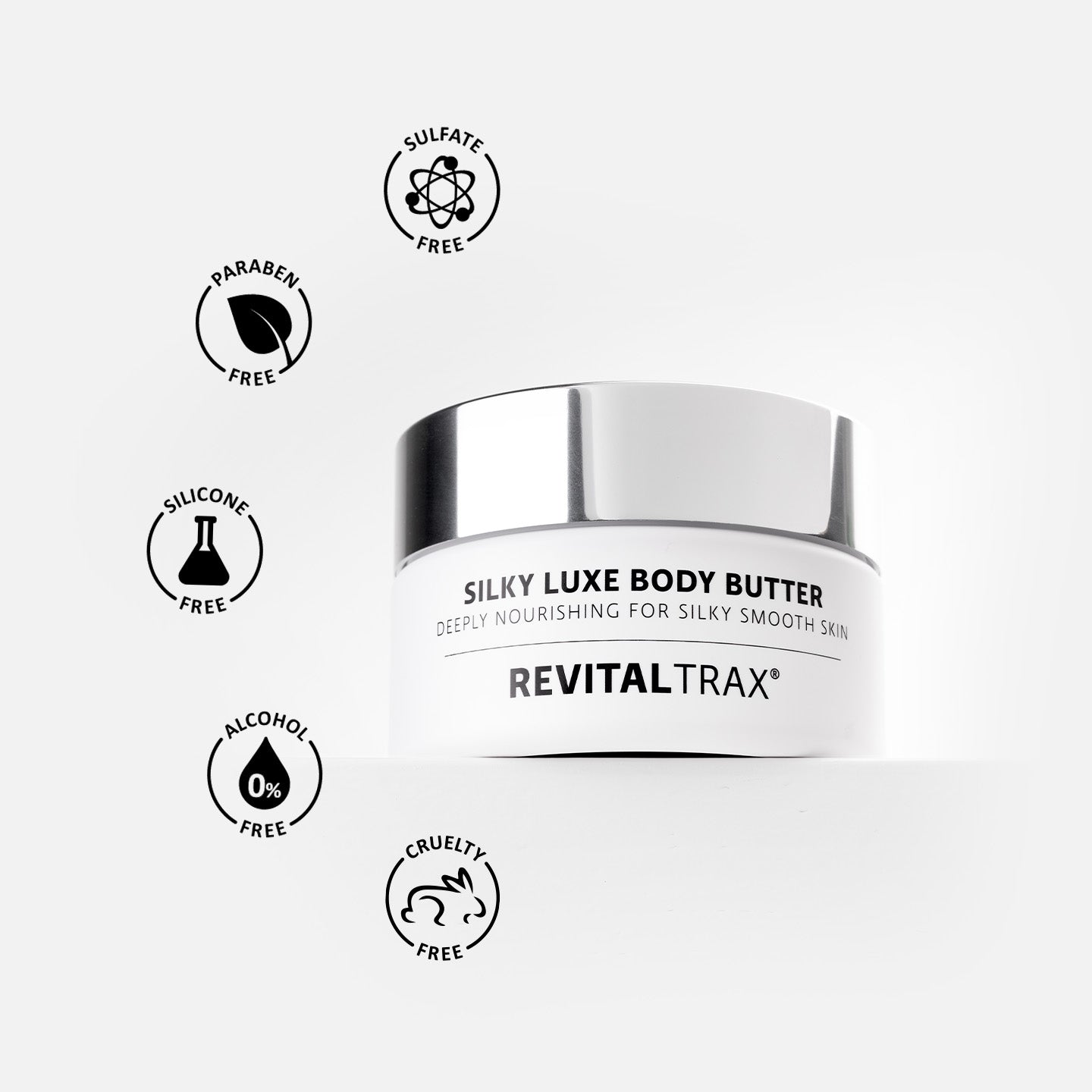The Silky Luxe Body Butter by RevitalTrax has a rich, creamy texture that melts into the skin, delivers intense hydration and leaves the skin feeling silky soft, smooth and comfortable, without feeling greasy or heavy. Ideal for daily use or whenever your skin needs extra care.