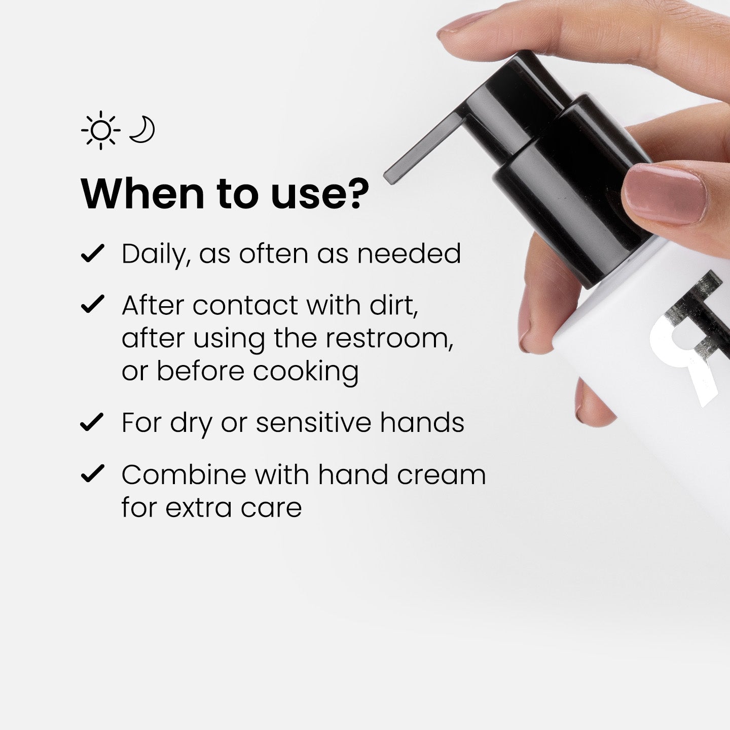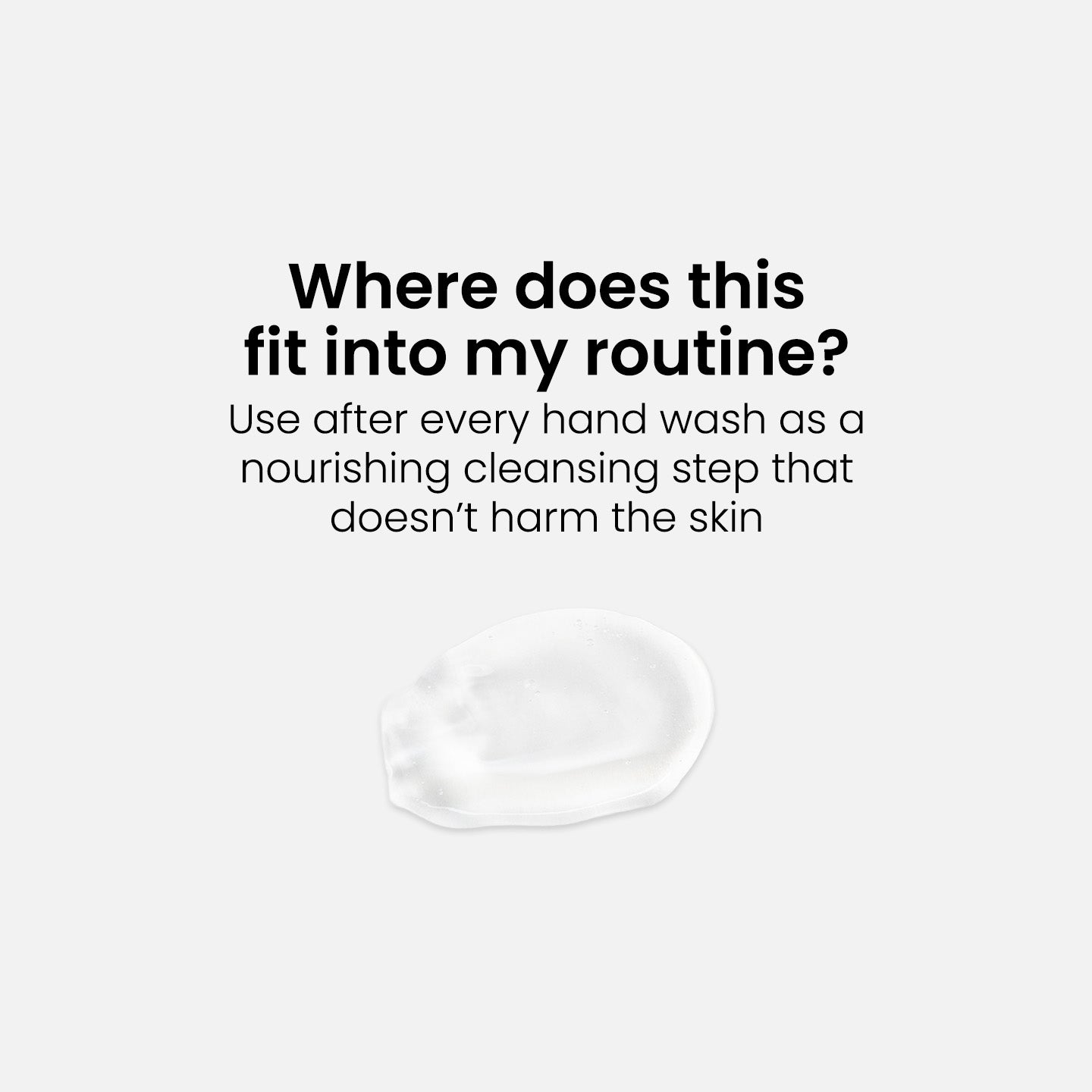 Apply the hand wash to damp skin and gently massage until it lightly foams. Then rinse with water. Afterward, apply the Ultra Rich Hand Cream to clean, dry skin.