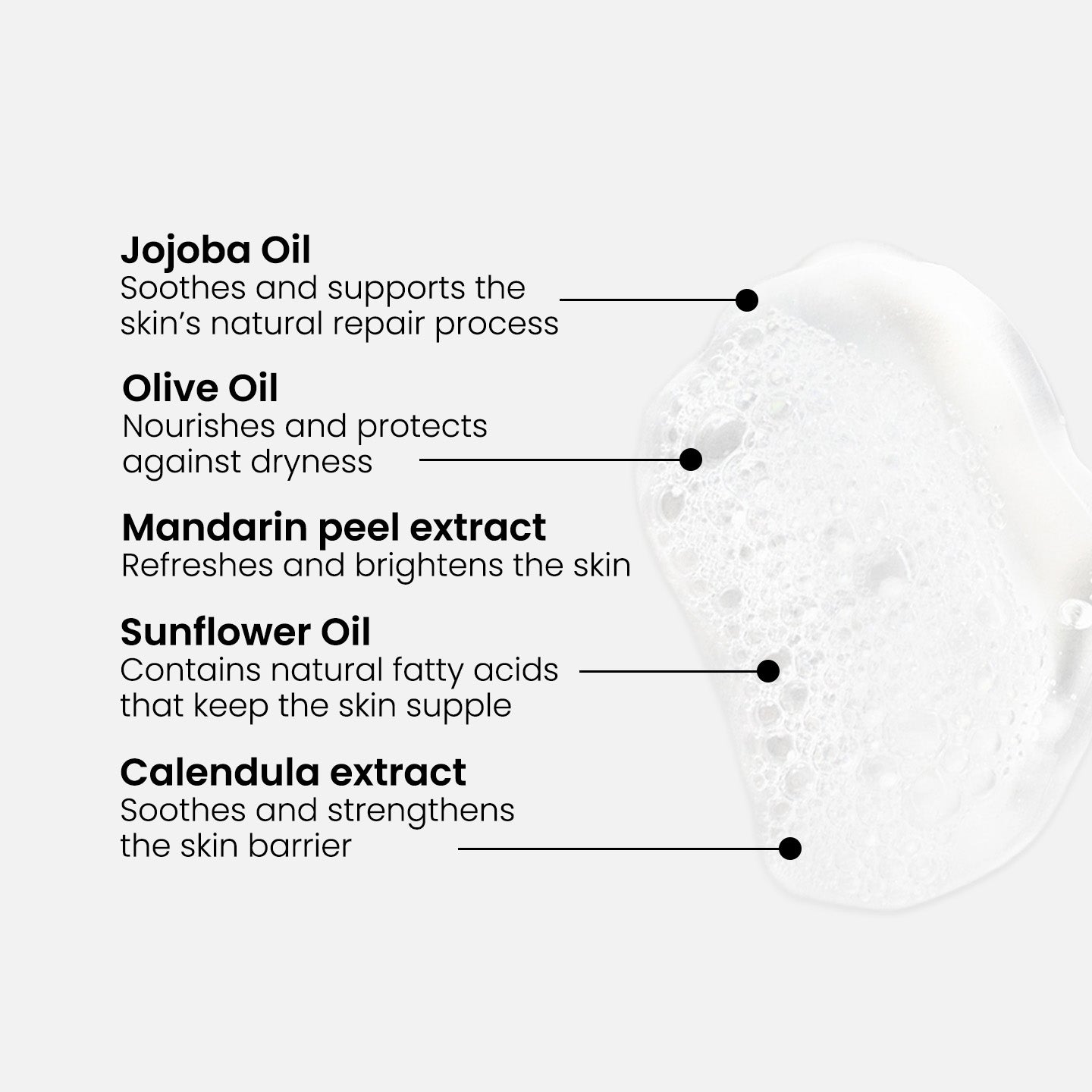 Aqua, Sodium Lauroyl Sarcosinate, Cocamidopropyl Betaine, Disodium Cocoamphodiacetate, Palm Kernelamide Dea, Jojoba Wax Peg-120 Esters, Peg-200 Glyceryl Stearate, Olive Oil Peg-7 Esters, Citrus Reticulata (Tangerine) Peel Extract, Helianthus Annuus (Sunflower) Seed Oil, Calendula Officinalis Flower Extract, Citric Acid, Lactic Acid, Tetrasodium Edta, Parfum, Dmdm Hydantoin.